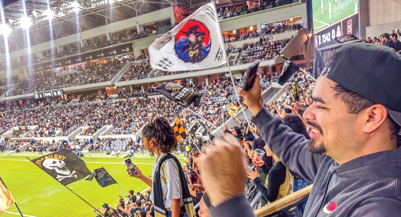 지난 8일 BMO 스타디움에서 열린 LAFC의 MLS 정규리그 마지막 홈경기에서 팬들이 승리를 확정짓는 순간 환호하고 있다. 이날 LAFC는 손흥민과 드니 부앙가가 각각 국가대표팀 차출로 결장한 가운데 토론토FC를 2-0으로 제압하며 6연승을 달성했다. 경기장에는 2만여 명의 관중이 몰렸고, 그중 다수의 한인 팬들도 태극 문양 깃발을 흔들며 응원을 펼쳤다.
