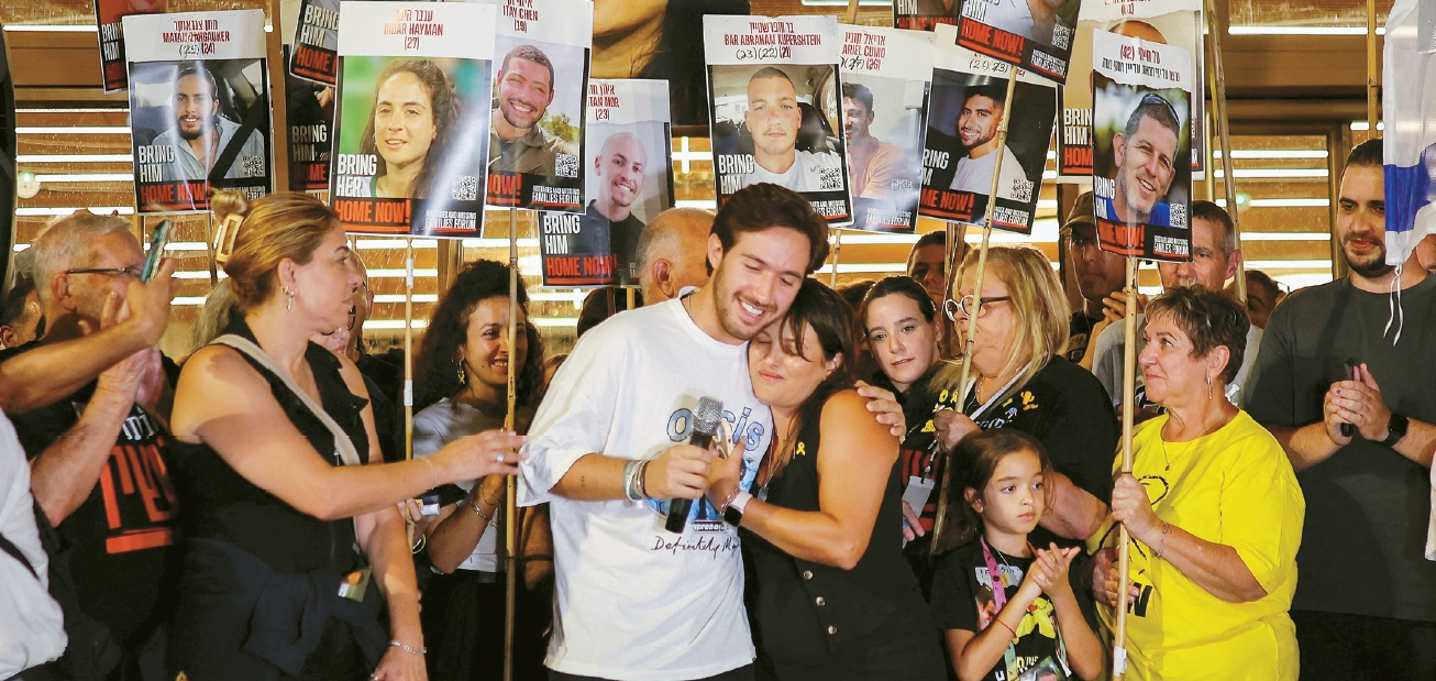 이스라엘과 팔레스타인 무장정파 하마스가 ‘가자 평화 구상’ 1단계에 합의했다. 이에 따라 하마스에 억류된 이스라엘 생존 인질 20명이 곧 석방되고, 이스라엘군도 단계적 철수에 나설 예정이다. 휴전 합의 소식이 알려진 9일(현지시간) 이스라엘 텔아비브 ‘인질 광장’에서 열린 집회에서 하마스에 피납됐다 석방된 오메르 쉠토브와 아밋 수사나가 끌어안고 기쁨의 눈물을 흘리고 있다. 〈관계기사 6면·본국지〉