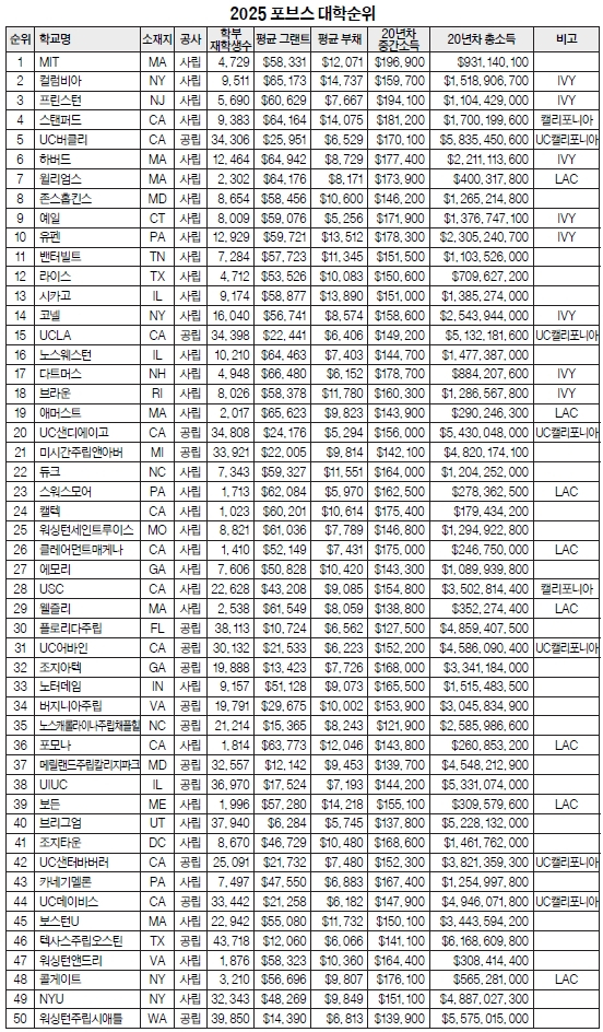 포브스 대학 순위의 1위는 MIT다. 특히 MIT의 20년차 중간 소득이 19만6900달러로 20만 달러에 육박하고 있는 것이 눈에 띈다. 특히 MIT는 졸업 후 3년 만에 평균 연봉이 11만 200달러에 달하고 대학 평가의 주요 지표로 삼는 1학년을 마치고 2학년에 오르는 비율이 99.8%를 기록한다는 점이다. 상위 10위에는 리버럴 아츠 칼리지(LAC)의 최강자 윌리엄스가 7위에 올랐고 '연구 강국' 존스 홉킨스가 8위, UC버클리가 5위에 포함됐다. 하버드를 비롯한 아이비리그 대학 8개 대학 중 5개가 톱10에, 나머지 모두 상위20위 안에 들었고 캘리포니아 주립인 UC의 3개 캠퍼스도 톱20위에 들었으며 톱50위에는 6개 캠퍼스가 올라 관계자들을 기쁘게 했다.