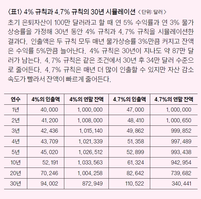 원금을 유지하면서 매년 4%씩 인출해 생활비로 쓸 수 있는 규칙을 제시했던 빌 벤젠이 최근 인출 비율을 4.7%로 올리는 새 모델을 제시했다.