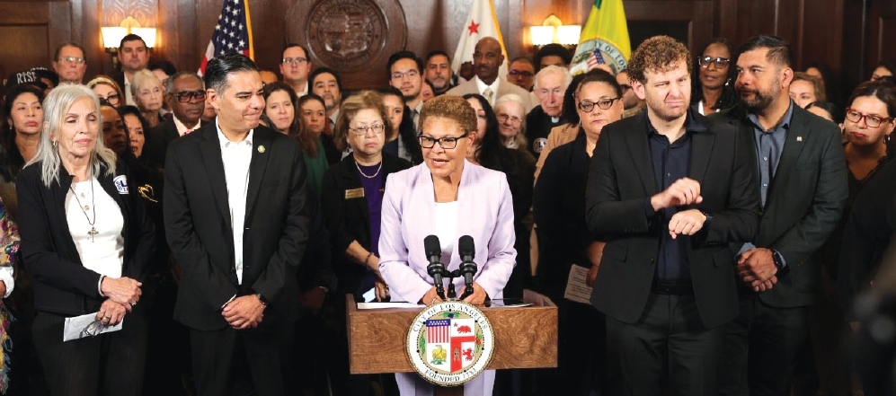 20일 캐런 배스(가운데) LA시장은 로버트 가르시아 연방하원의원(민주·앞줄 왼쪽 두 번째) 등과 함께 불법체류자 단속 과정에서 이민단속국(ICE)의 불법 구금 및 인권침해 의혹에 대한 의회조사를 촉구했다. 가르시아 의원은 "많은 사람이 변호사 접견권도 없이 구금되고 있다"고 주장했다.