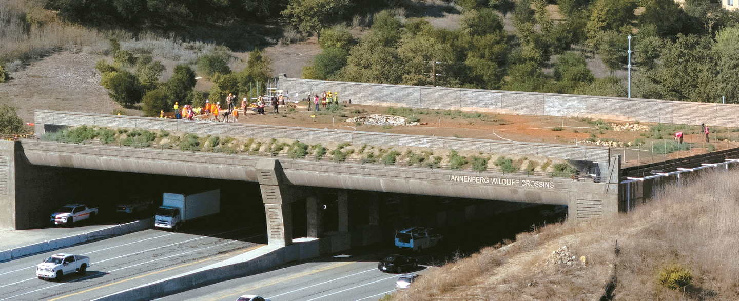 LA 아고라힐스 인근 101번 프리웨이 위에 건설 중인 ‘애넌버그 야생동물 횡단교(Annenberg Wildlife Crossing)’가 착공한 지 3년 6개월여 만에 완공을 앞두고 막바지 공사가 한창이다. 이 다리는 주거지와 산악지대를 가르는 고속도로를 안전하게 넘을 수 있도록 설계됐다. 길이 210피트, 폭 174피트로 세계 최대 규모의 야생동물 전용 다리다. 산사자·사슴·여우·코요테 등 각종 야생동물이 도심과 산지를 오가며 생태계를 유지할 수 있도록 돕는다. 지난 21일 공사 관계자들이 다리 상판에 식생을 심고 토양을 다지는 등 복원 작업을 진행하고 있다.