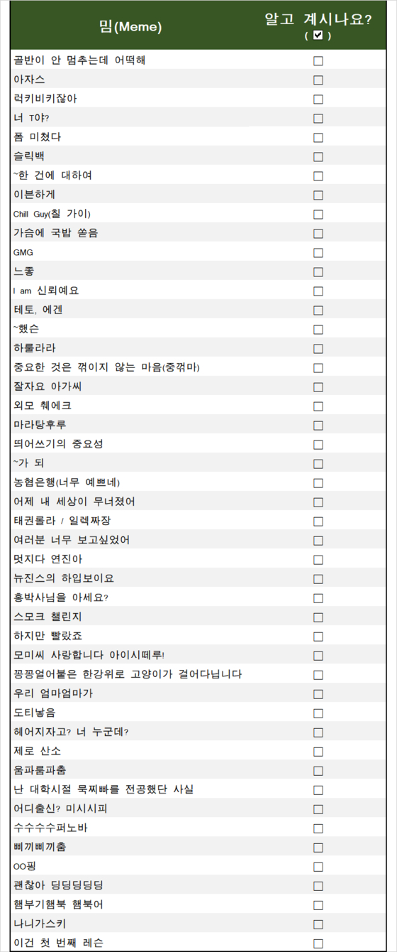 여기서 잠깐, 스크롤을 멈추고 다음 리스트를 확인해 보세요. 최근 2년간 등장한 대표 밈이랍니다. 여러분은 이 중 몇 개를 알고 있나요.