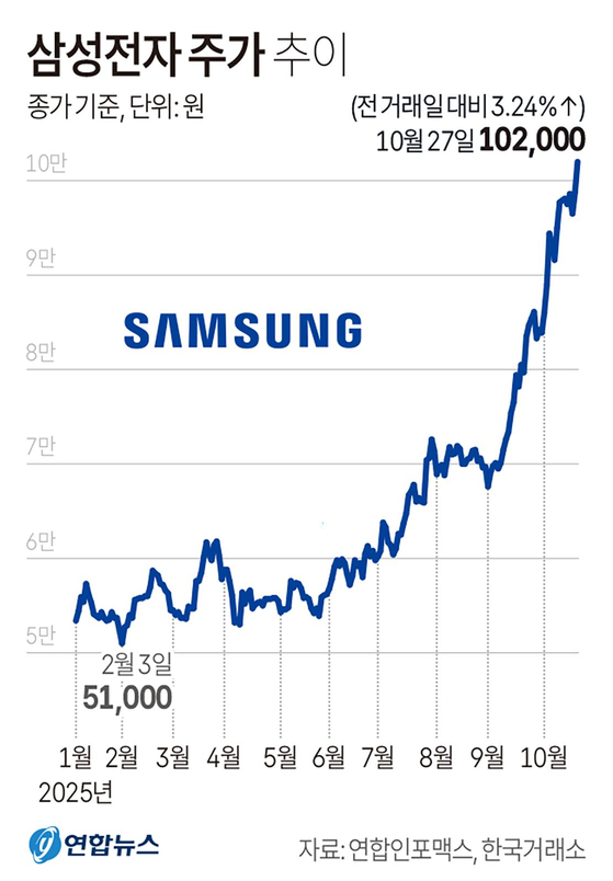 삼성전자도 이날 10만원을 넘으며 3.24% 오른 10만 2000원에 마감했다. 삼성전자 주가가 10만원을 넘은 것은 이번이 처음이다. 이에 힘입어 시가총액도 600조원을 경신했다. 특히 이날은 이재용 삼성전자 회장의 취임 3주년 날이었다.