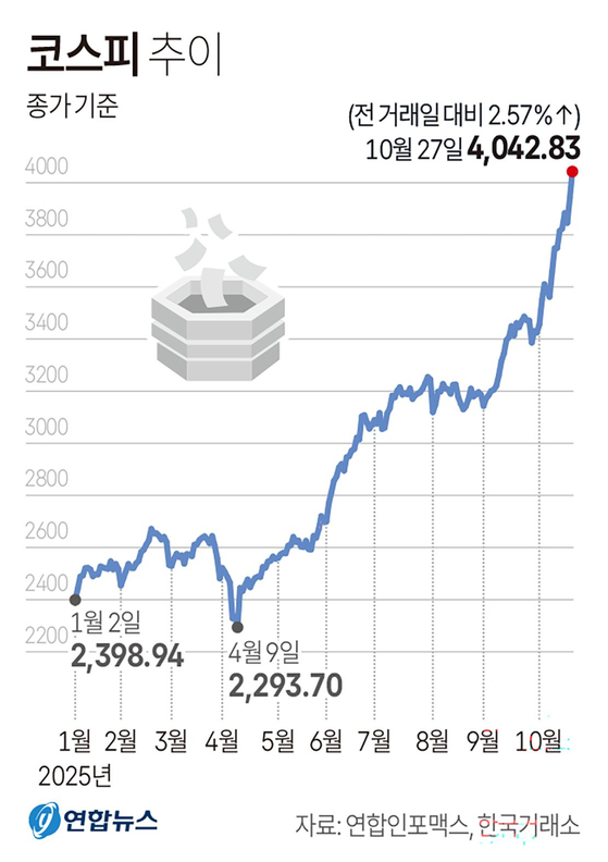 27일 코스피는 전 거래일 대비 101.24포인트(2.57%) 상승한 4042.83으로 장을 마쳤다. 코스피는 이날 3999.79로 출발해 곧장 4000선을 돌파했다. 지난 6월 20일 3000선을 넘어선 뒤 넉 달 남짓 만에 1000포인트 넘게 치솟았다.