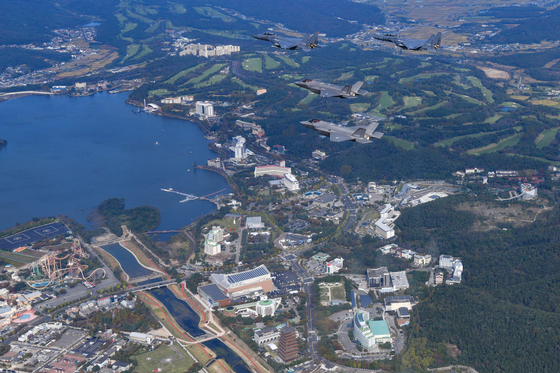 2025 APEC 정상회의를 앞둔 27일 공군 F-35A 2기와 F-15K 2기가 경주화백컨벤션센터 일대 상공에서 공중전투초계 임무를 수행하고 있다. [사진 공군]
