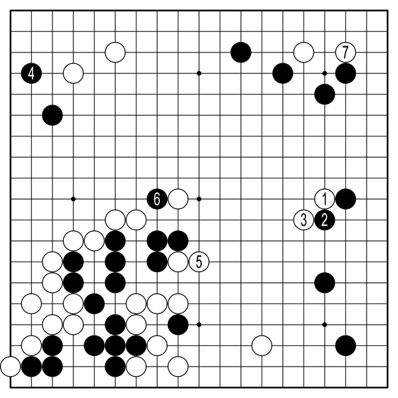 ◆실전 진행=실전에서 박상진의 선택은 백1. 흑2엔 백3으로 중앙 공격에 핀트를 맞춘다. 자오천위는 손 빼고 흑4로 달려간다. 백5의 공격은 흑6으로 타개할 수 있다고 본다. 여기서 박상진은 백7로 방향을 바꾼다. 공격을 멈추고 잠시 숨을 돌린다.
