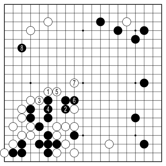 장면 ③=백1로 붙여 공격한다. 이 흑 대마는 죽을 돌이 아니다. 그렇다면 공격의 목적은 무엇인가. 좌상 백진을 키우려는 것이다. 쉬운 문답이다. 그렇다면 언제 공격을 멈출 것인가. 이건 어렵다. 박상진은 백7로 한 번 더 공격했고 그 순간 자오천위는 흑8로 돌입해왔다. 백7로 8의 자리에 둔다면 백진은 거의 집이 될 수도 있었다. 그런 유혹을 뿌리치고 7을 선택한 것은 선악을 떠나 대담성이 느껴진다.