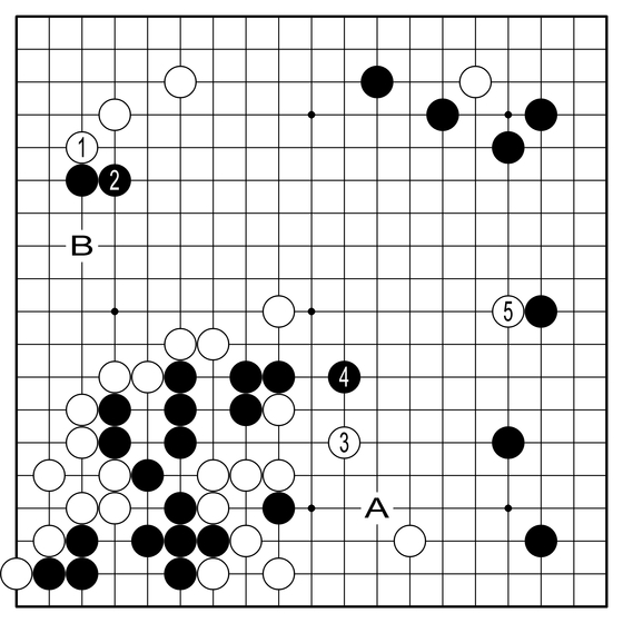◆AI의 처리=AI는 일단 백1을 하나 선수한다. 다음 백3 자리가 블루 스폿이다. AI는 대마 공격도 공격이지만 흑이 A로 덤벼오는 수를 줄곧 경계해왔다. 백3도 흑A를 염려한 수다. 흑4로 달아나면 성동격서라 할 백5의 붙임. 백B로 공격할 만 한데 AI는 별 언급이 없다. 그쪽은 급하지 않다는데 AI와 대국자 모두 공감하는 모습이다.