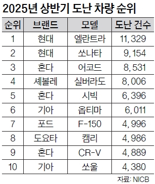 비영리 단체인 전국보험범죄국(NICB)이 발표한 최신 통계에 따르면, 지난 상반기 현대 엘란트라의 절도 건수는 총 1만1329건으로 전국에서 가장 많았다. 전체 차량 절도의 약 3.4%를 차지했다. 〈표 참조〉