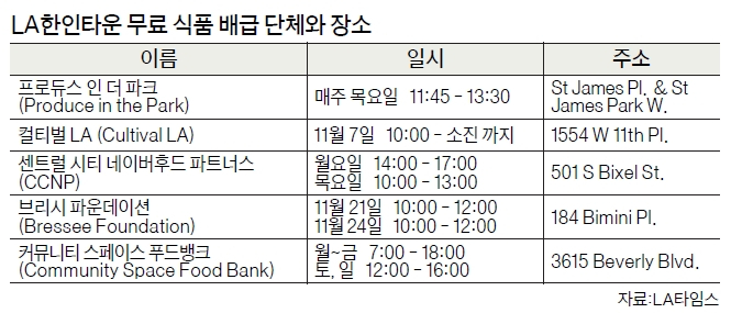 한인타운 인근에서도 무료 식료품 배급이 활발히 진행되고 있다. 현재 한인타운 인근에서는 ▶프로듀스 인 더 파크(Produce in the Park) ▶컬티벌 LA(Cultival LA) ▶센트럴 시티 네이버후드 파트너스(CCNP) ▶브리시 파운데이션(Bressee Foundation) ▶커뮤니티 스페이스 푸드뱅크(Community Space Food Bank) 등 5곳에서 식료품을 나누고 있다. 〈표 참조〉