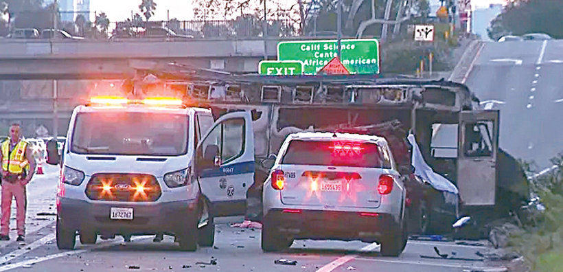 6일 오전 2시경 LA 제퍼슨파크 인근 10번 프리웨이 동쪽 방면에서 푸드트럭과 승용차가 충돌해 차량이 화염에 휩싸였다. 이 사고로 1명이 숨지고 1명이 크게 다쳤다. 사고 여파로 프리웨이 동쪽 3개 차선과 알링턴 애비뉴 진입로가 일시 폐쇄됐다가 오전 7시 45분경 재개통됐다. [캘트랜스 제공]