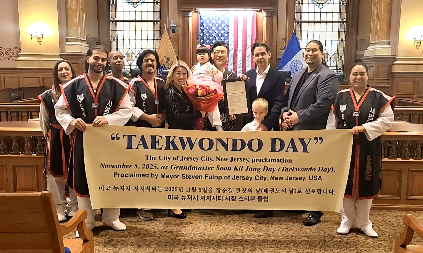 인구 30여 만명으로 뉴저지주에서 두 번째로 큰 도시인 저지시티가 지난 5일 시청에서 한국의 전통무술 태권도 보급과 지역사회 발전에 기여한 ‘장스타 태권도’ 장순길 관장(뒷줄 오른쪽 세 번째)을 기리는 ‘장순길 관장의 날’ 선포식을 개최했다. 장 관장은 30여 년 전 한인들이 많지 않던 저지시티에 태권도장을 설립, 주류사회에 한국 전통무술을 널리 보급하는 한편 다양한 분야에서 지역사회 발전에 헌신해 뛰어난 무도인, 청소년들의 롤모델로 존경을 받고있다.