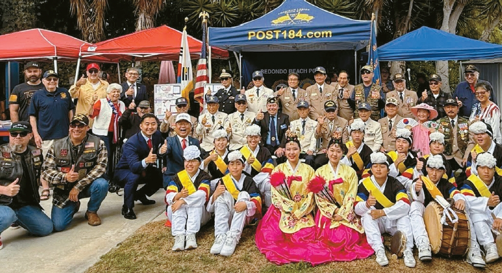 11일 베터런스데이를 맞아 한·미 재향군인들이 한자리에 모였다. 이날 레돈도비치 미군재향군인회 사우스베이 ‘Post 184’ 회관에서 열린 기념식에서는 파바월드 학생들이 부채춤·사물놀이·K-팝 댄스 공연을 선보였다. 양국 재향군인들이 함께 기념촬영을 하고 있다.