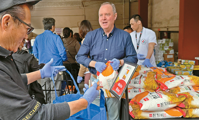 연방정부 셧다운으로 캘프레시(푸드스탬프) 혜택을 받지 못한 저소득층 돕기 행사가 13일 LA한인타운 이웃케어클리닉에서 열렸다. 이날 가구당 15파운드 쌀 한 포대와 라면, 치킨스프, 옥수수 통조림, 화장지 한 박스 등이 전달됐다. 애덤 쉬프 연방 상원의원이 참석 주민에게 쌀을 건네고 있다. 김상진 기자