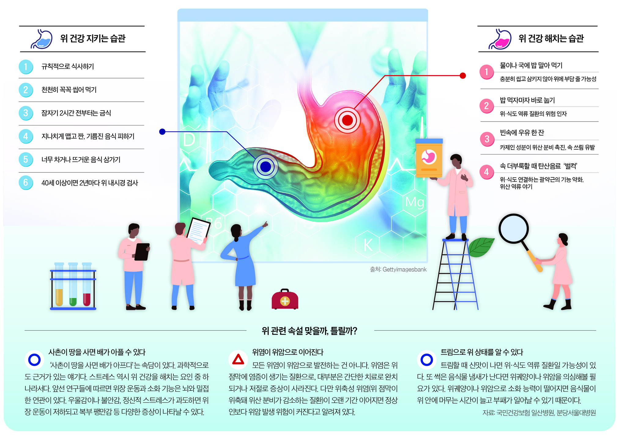 위 건강 챙기는 비법 과음·폭식·자극적인 음식 자제 역류성 식도염 신호 땐 조기 대응 늦은 저녁 후엔 20분 산책해야