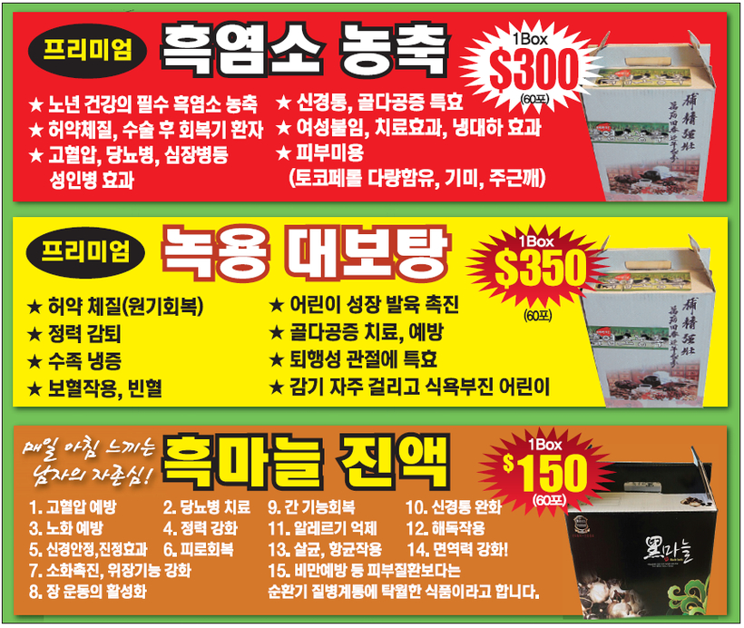 이외에도 프리미엄 녹용대보탕은 350달러로 면역력 강화, 체력 증진, 성장기 어린이의 발육 등에 도움을 주며, 흑마늘 진액과 도라지배즙 각각 150달러로 남성 건강 및 기관지 관리에 특화된 기능성을 자랑한다. 이처럼 다양한 가격대와 효능을 갖춘 제품군이 구성돼 있어 지인이나 가족의 건강 상태에 따라 선택의 폭도 넓다.