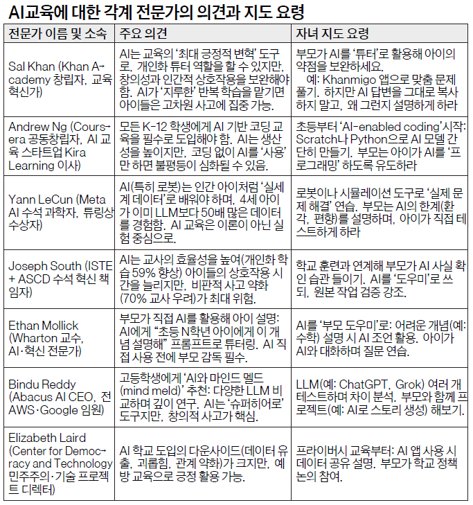 튜링상 수상자인 얜 르쿤은 AI교육은 이론보다는 실험중심이어야 한다는 견해를 밝혔다. 이던 몰럭 와튼스쿨 교수는 부모의 감독이 필수며 부모는 AI를 부모 도우미로 사용해야 한다고 강조했다. 표 참조〉