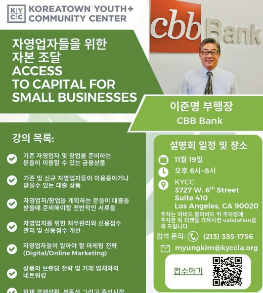 이어 19일에는 자영업자 자금조달 세미나가 열린다. 이날은 오후 6시 KYCC(3727 W 6th St. #410)에서 진행된다. 해당 세미나는 이준명 CBB 은행 부행장이 강사로 나선다. 자영업자들이 알아야 하는 재무관리, 신용점수 관리, 마케팅 전략, 브랜딩 전략 등을 전할 예정이다. 또 이 부행장은 자영업자들이 알아야 할 경제 상황 전반에 대해서도 강의한다.