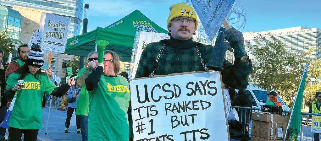 17일 UC시스템 산하 18개 캠퍼스와 의료시설에서 근무하는 AFSCME 3299 소속 직원들이 이틀간의 파업에 돌입했다. 조합원들은 임금 인상과 생활임금 보장을 요구하며 시위를 벌이고 있다. 사진은 UC샌디에이고 조합원들의 피켓 시위 모습.