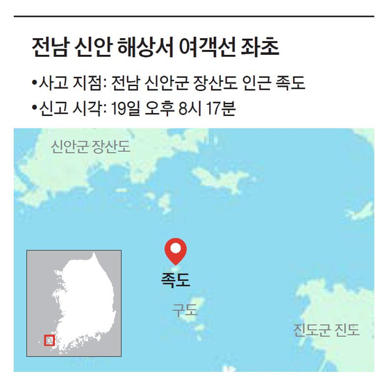 해경은 사고 여객선이 정상 항로를 이탈한 것으로 파악했다. 해경 관계자는 “인명 구조가 우선이라 정확한 원인은 차후에 조사할 예정”이라면서도 “(여객선이 통상 운행하는) 항로는 아니었다”고 말했다. 다른 해경 관계자는 “여객선에서 엔진 등에 문제가 발생해 항로를 벗어난 것인지, 운항 과실인지 등 여러 가능성이 열려 있다”고 설명했다.