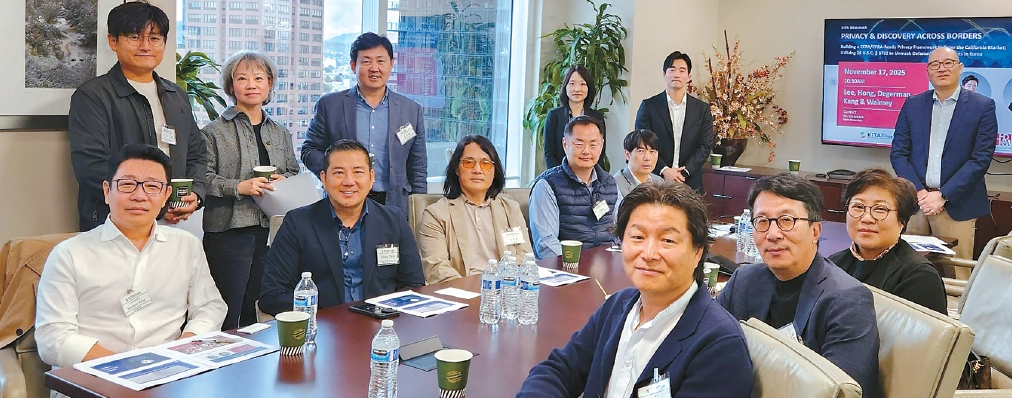 캘리포니아한국기업협회(KITA·회장 김한수)가 지난 17일 리·홍·디거먼·강앤웨이미 로펌에서 글로벌 개인정보 규제와 국경 간 디스커버리 전략을 주제로 세미나를 개최했다. 이날 구요셉·윤수진 변호사가 가주 소비자 프라이버시법·개인정보보호법 등 법제 동향, 해외 증거개시 사례와 한·미 소송 전략을 설명했다. 세미나를 마치고 김한수(왼쪽 앞줄 첫 번째) 회장과 회원들이 기념촬영을 했다.