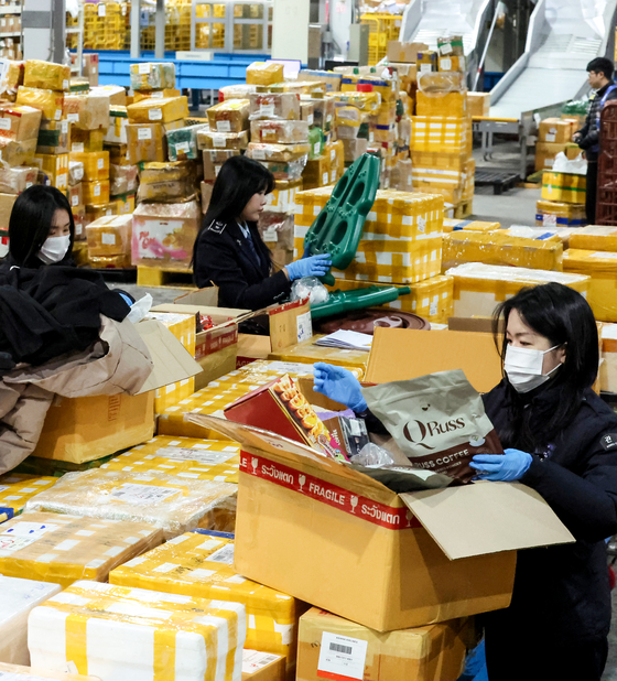 블랙프라이데이를 앞둔 20일, 인천 중구 인천공항세관본부 특송물류센터에서 관세청 직원들이 해외 직구 물품을 검사하고 있다. 블랙프라이데이는 추수감사절(11월 4째주 목요일) 다음날인 금요일로 연말 쇼핑 시즌의 시작을 알린다.