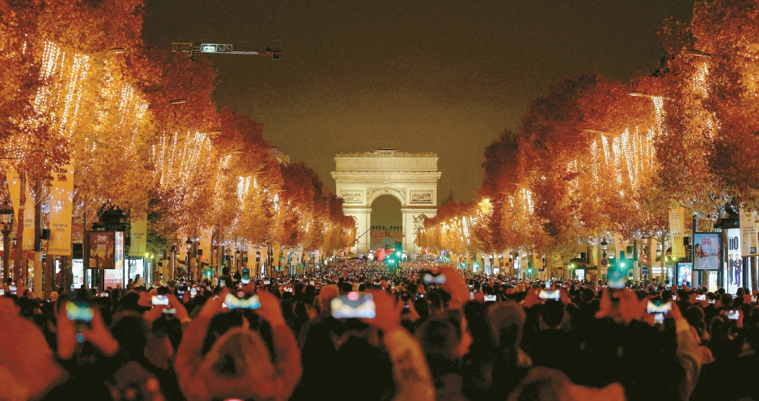 계절은 크리스마스로 향하고 있다. 지난 16일 저녁 파리 샹젤리제 거리가 황금빛으로 물들었다. 매년 이맘때 시작되는 성탄 조명은 이듬해 1월 초까지 이어진다. 도심의 연말 분위기를 한껏 고조시키는 동시에 상권과 관광 활성화를 도모하기 위한 행사다. 가을 끝자락, 붉은 단풍의 가로수들에 걸린 조명이 환하게 밝혀지자 시민과 관관객들이 그 순간을 휴대 전화에 담고 있다.