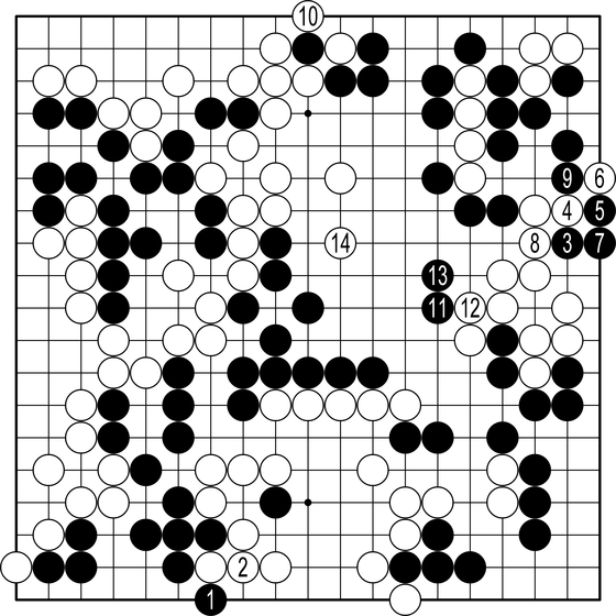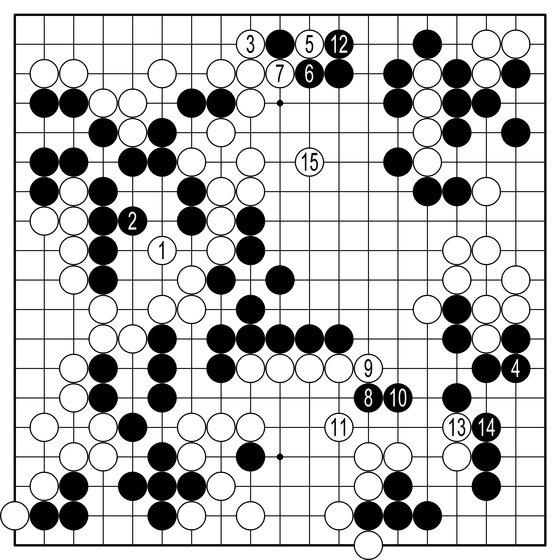 백5, 7이 확실한 승리를 놓쳤다. 흑8의 선수 삭감이 컸다. 이런 곳은 크기를 산술적으로 재기 어렵다. 직감이 중요하다.