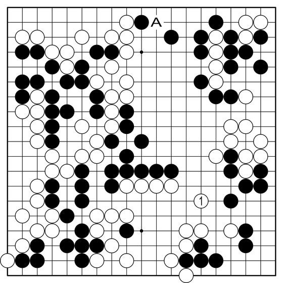 ◆AI의 계산=AI는 A로 한 점 잡는 대신 백1로 지켰으면 조금 넉넉히(1집반 정도) 이겼다고 한다. 하나 실전에서 백1 같은 수는 정말 두기 어렵다. A는 분명한 현찰인데 백1은 그리 커 보이지 않는다. 하나 백1은 역끝내기다. 이곳을 놓쳐 다시금 반집 승부가 됐다.