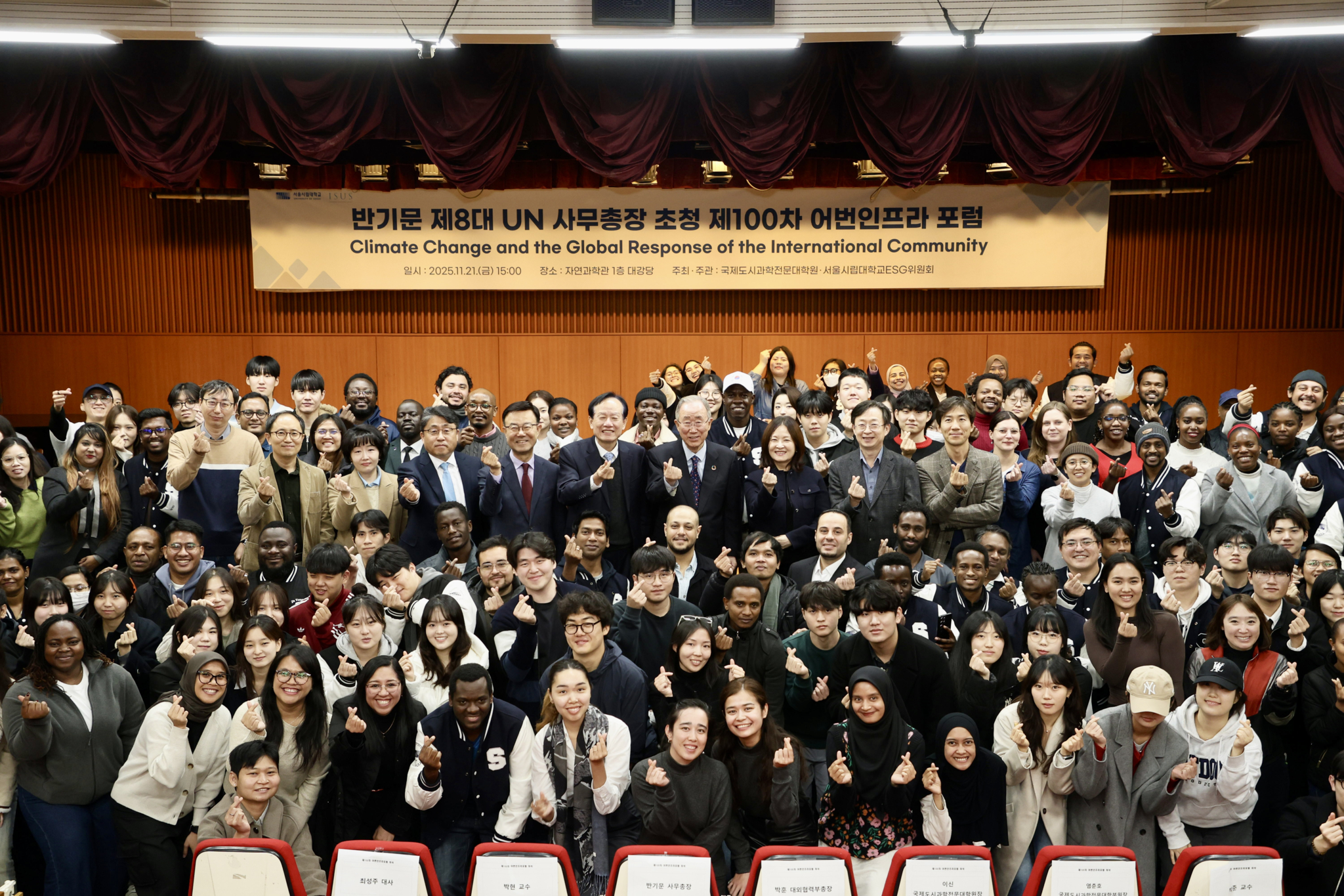 서울시립대학교(총장 원용걸)는 2025년 11월 21일(금) 자연과학관 대회의실에서 제100회 어번인프라포럼을 기념해 반기문 제8대 UN 사무총장을 초청, ‘기후변화와 국제사회의 대응’을 주제로 특별강연을 개최했다고 22일 밝혔다. 이번 강연에는 개발도상국 공무원 연수생과 대학(원)생 등 300여 명이 온·오프라인으로 참석했다.