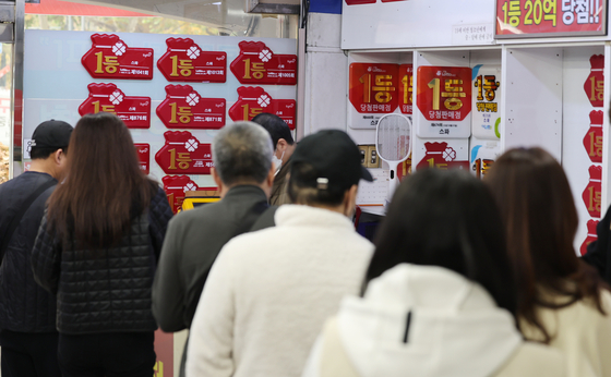 24일 서울 노원구 복권 판매점에 줄을 선 시민들. 기획재정부 복권위원회에 따르면 올해 상반기 복권 판매액은 3조9475억5900만원으로 상반기 기준 역대 최대다. 경기 침체와 자산시장 변동성이 복권 판매 증가를 부추기고 있다는 분석이 나온다. [뉴스1]