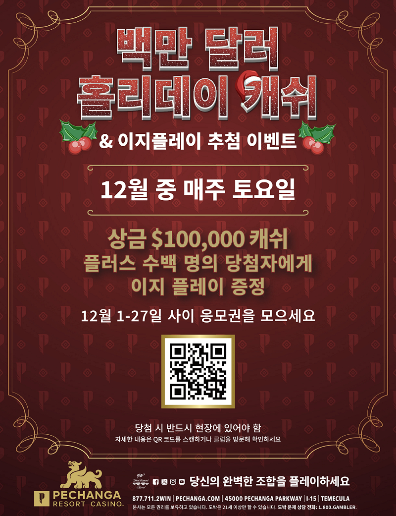 페창가 리조트 카지노가 이번 12월 연말 시즌, 백만 달러 홀리데이 추첨 이벤트를 통해 거액의 현금 및 이지플레이를 상금으로 제공한다. 참가 방법은 간단하다. 페창가 클럽 카드에 가입하고, 12월 동안 좋아하는 슬롯 또는 테이블 게임을 즐긴 뒤, 12월 한달 간 매주 토요일 카지노를 방문해 응모권을 활성화하면, 자신의 이름이 당첨자로 호명되는 행운을 잡을 수 있다.