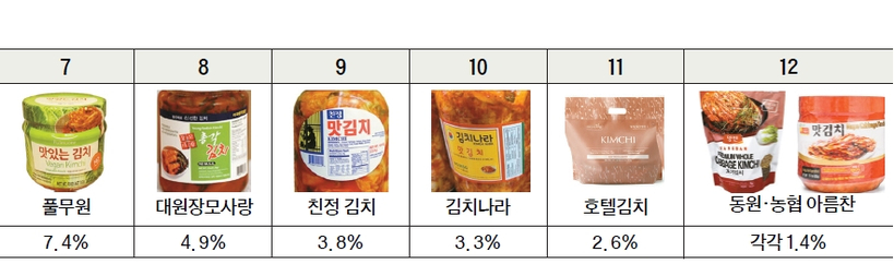 브랜드 선호도는 뚜렷했다. 종가집 김치가 42.7%로 1위를 차지했고 오씨네 김치(31.3%), 개성김치(20.1%), 농협 풍산김치(19.4%), 비비고 김치(11.5%), 하선정 김치(9.2%), 풀무원 김치(7.4%) 등이 상위권에 올랐다. 대원장모사랑·호텔김치(워커힐)·친정김치·김치나라·동원김치·농협 아름찬 김치 등도 꾸준한 고정 층을 보유한 것으로 나타났다.