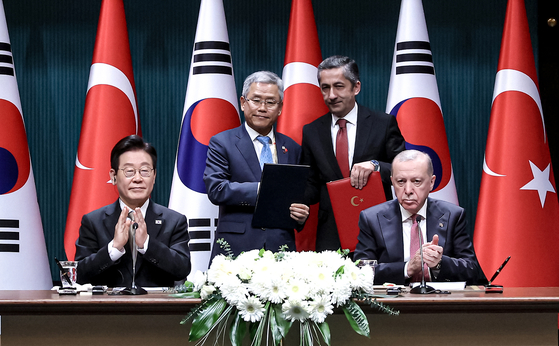 이재명 대통령과 레제프 타이이프 에르도안 튀르키예 대통령이 24일(현지시간) 앙카라 대통령궁에서 정상회담을 갖고 원자력발전, 방위산업, 바이오, 인프라 분야 등의 구체적인 협력 방안을 논의했다. 이날 양국 정상이 참석한 가운데 김동철 한국전력공사 사장과 네자티 야마츠 튀르키예 원자력공사 사장(뒷줄 왼쪽부터)이 원자력 협력에 관한 MOU를 체결하고 있다.