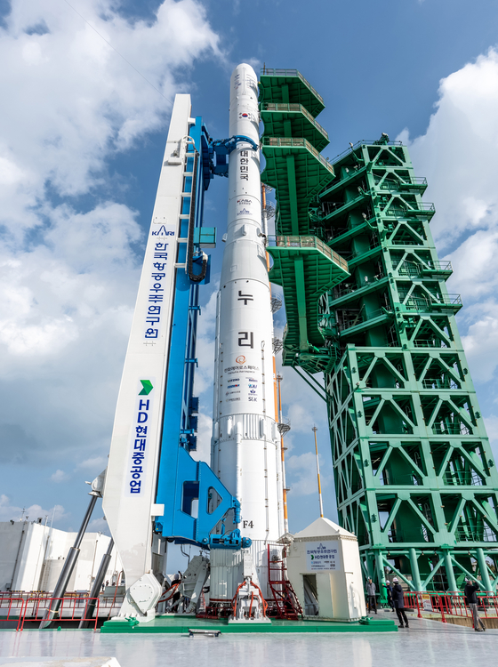 한국형 발사체 누리호가 25일 전남 고흥군 나로우주센터 발사대에 기립 및 고정됐다. 이날 오후 1시36분 고정작업이 완료된 누리호는 기밀점검 등 발사 준비 작업을 수행한 후 27일 0시55분 발사될 예정이다. [사진 한국항공우주연구원]