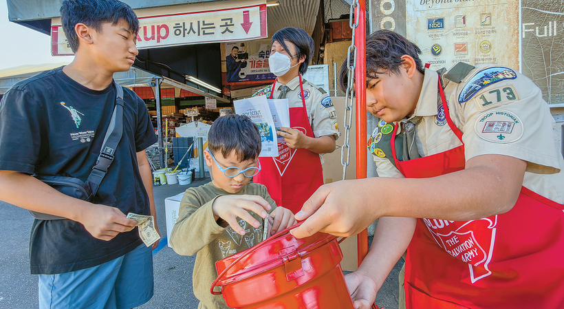 올해도 LA한인타운에 구세군 자선냄비가 등장했다. 자선냄비는 한남체인과 김스전기 입구 등 두 곳에서 크리스마스 이브인 다음 달 24일까지 운영된다. 25일 김스전기 앞에서 자원봉사자인 딜런 김(오른쪽 두 번째) 군과 대니얼 김(오른쪽) 군이 모금 활동을 하고 있다. 김상진 기자