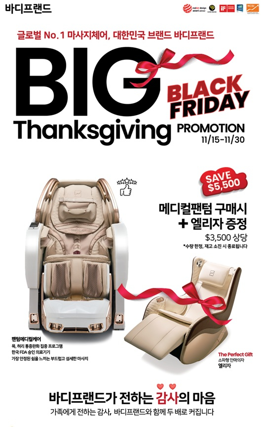 바디프랜드 '감사의 마음' 프로모션 글로벌 헬스케어 브랜드 '바디프랜드(BODYFRIEND)'가 감사의 계절을 맞아 특별한 프로모션을 진행한다. 행사 기간 중 프리미엄 의료기기급 모델인 메디컬 팬텀(Medical Phantom) 구매 고객에게 3500달러 상당의 소파형 안마의자 엘리자(Eliza)를 무료로 증정한다. 하나의 구매로 집 안의 두 공간에 각각 다른 형태의 힐링을 더할 수 있어 실용성과 만족도를 모두 갖춘 구성으로 평가된다. 여기에 고객 부담을 낮추기 위한 0% 금융 무이자 할부도 가능하다. 프로모션은 바디프랜드 라운지 매장에서 직접 체험 후 안내받을 수 있으며, 체험 예약 및 문의는 아래 매장으로 가능하다.