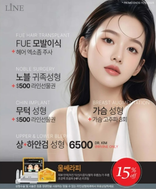 라인성형외과 연말 스페셜 프로모션 LA와 어바인에 위치한 '라인성형외과'가 연말을 맞아 인기 성형.피부 시술의 스페셜 프로모션을 진행한다. FUE 모발이식, 노블 귀족성형, 무턱 성형, 가슴 성형, 상.하안검 성형 등이 대표적이며, 초강력 초음파 리프팅인 울쎄라피는 15% 할인가에 제공한다. 이와 함께 LA 지점에서는 상반신 바디경락과 배 고주파 프로그램, 자가혈 PRP.스킨케어 패키지, 스컬트라와 리쥬란 힐러, 어바인 지점에서는 벨로테로 필러와 보톡스, 리쥬란 힐러, 피코슈어 레이저와 PDRN 주사 패키지 등이 특가로 제공된다. 자세한 문의 및 상담은 각 지점을 통해 가능하다.
