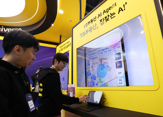 26일 서울 서초구 aT센터에서 열린 ‘코리아 핀테크 위크 2025’ 우리금융 부스(위 사진)에서 관람객이 인공지능(AI) 키오스크로 맞춤형 카드를 만들고 있다. 같은 행사에서 KB금융은 AI 에이전트 기술을 이용한 ‘집 찾는 AI’ 서비스 등을 선보였다. ‘핀테크 X AI, 금융에 취향을 더하다’란 주제의 이번 행사는 오는 28일까지 열린다. [뉴스1]