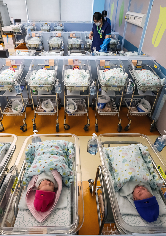 26일 경기도 고양시 한 종합병원 신생아실에서 간호사들이 신생아들을 돌보고 있다. 국가데이터처는 이날 ‘2025년 9월 인구 동향’을 통해 올해 9월 출생아 수가 2만2369명으로 지난해 같은 달보다 1780명(8.6%) 증가했다고 발표했다. [연합뉴스]