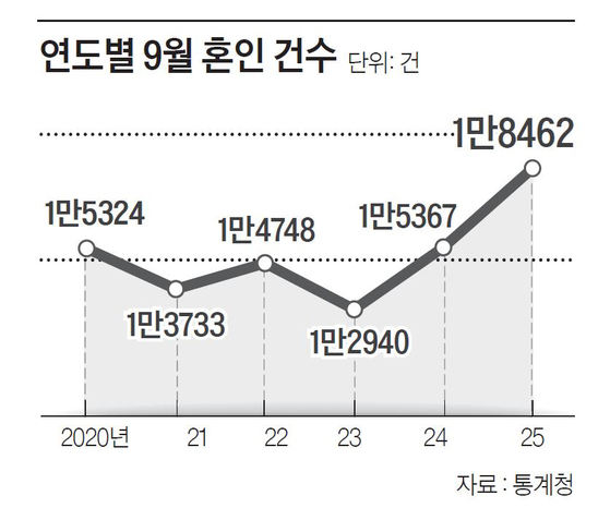 국가데이터처가 26일 발표한 ‘2025년 9월 인구동향’에 따르면 지난 9월 혼인 건수는 1만8462건으로 전년 동월 대비 20.1%(3095건) 증가했다. 혼인 건수는 지난해 4월부터 1년6개월 연속 증가 추세다. 9월 기준으로 2015년(1만9001건) 이후 최대 규모다. 증가 폭과 증가율은 1981년 관련 통계 작성 이후 가장 높았다. 1~9월 누적으로 봐도 올해 17만6178명으로 지난해(16만1761명)보다 8.9% 증가했다