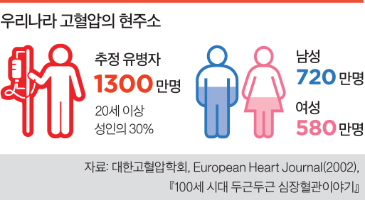 일반적으로 고혈압은 수축기 혈압 140㎜Hg 이상 또는 이완기 혈압 90㎜Hg 이상일 때를 가리킨다. 뚜렷한 증상이 없어 방치되기 쉽지만, 해마다 1000만 명 이상이 고혈압 관련 질환으로 목숨을 잃는다. 전 세계 사망 원인 1위인 심혈관 질환도 예외는 아니다. 세계보건기구(WHO)에서 발표한 내용을 보면 심혈관 질환으로 인한 사망의 53%, 뇌졸중 사망자의 58%가량은 고혈압에서 기인하는 것으로 파악된다. 심혈관 질환 중에서도 급성 심근경색은 돌연사의 가장 흔한 원인으로 초기 사망률이 30%에 달한다. 환자의 절반 이상은 병원에 도착하기도 전에 사망한다.