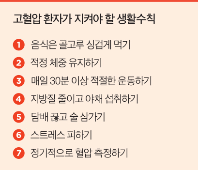식습관만큼이나 운동도 중요하다. 운동은 혈압을 낮출 뿐만 아니라 혈중 콜레스테롤을 감소시키는 역할도 한다. 엘리베이터 대신 계단 이용하기, 매일 하루 30분 걷기 등을 추천한다. 다만 축구나 농구처럼 경쟁적인 구기 운동은 혈압을 갑작스레 높일 수 있어 피하는 게 좋다.
