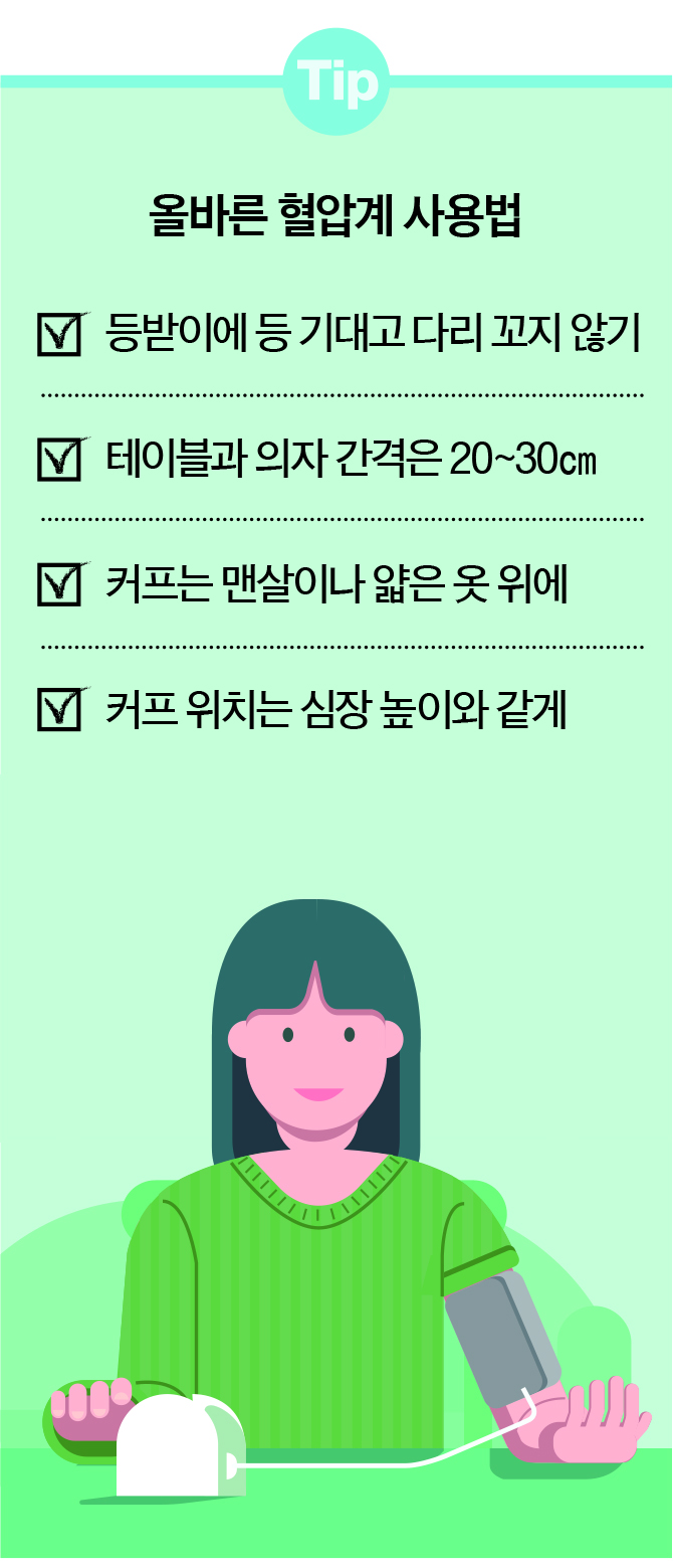 본격적으로 혈압을 잴 차례다. 안정을 취할 수 있는 조용한 장소에서 허리를 펴고 바른 자세로 앉는다. 등을 기대지 않거나 다리를 꼬고 앉으면 혈압이 2~10㎜Hg 더 높게 나올 수 있어 주의해야 한다. 혈압계의 커프(착용 부위의 혈류를 외부에서 압박해 차단하는 압박대)는 심장 높이와 같은 위치의 위팔(upper arm)에 감는다. 가능하면 맨팔이나 얇은 옷 위에 착용하고 손가락 한 개가 들어갈 정도의 여유를 남긴다. 이후 팔 힘을 풀고 약간 구부린 채 책상 위에 올려 놓으면 된다.