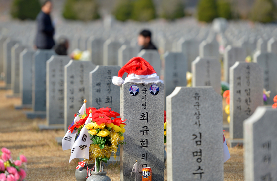 지난달 30일 오후 대전시 유성구 국립대전현충원 장병 묘역에 안장된 해군 고 최규희 이병 묘비에 산타모자가 씌워져 있다. 최 이병은 지난 2012년 해군 다도해함에서 소화방수 훈련 및 직무 교육 중 순직했다. 유족은 매년 크리스마스가 다가오면 묘비에 산타 모자를 씌우고 있다.