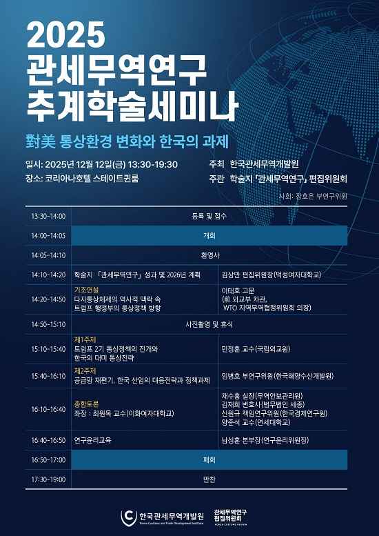 한국관세무역개발원(주최)과 학술지 『관세무역연구』 편집위원회(주관)는 2025년 12월 12일(금) 광화문 코리아나호텔에서 「2025 관세무역연구 추계학술세미나」를 개최한다.