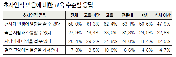 연구에 따르면 초자연적 현상에 대한 믿음은 과학이나 의학에 대한 신뢰가 떨어진 것과 관련이 있었다. 죽은 사람과 소통할 수 있다는 믿음은 천사보다 낮았지만 교육 수준이 낮은 고졸 미만이 16.4%로 가장 낮았고 학사 소지자는 24.9%나 됐다. 과학에 대한 신뢰 저하와 연관이 있는 부분이다.