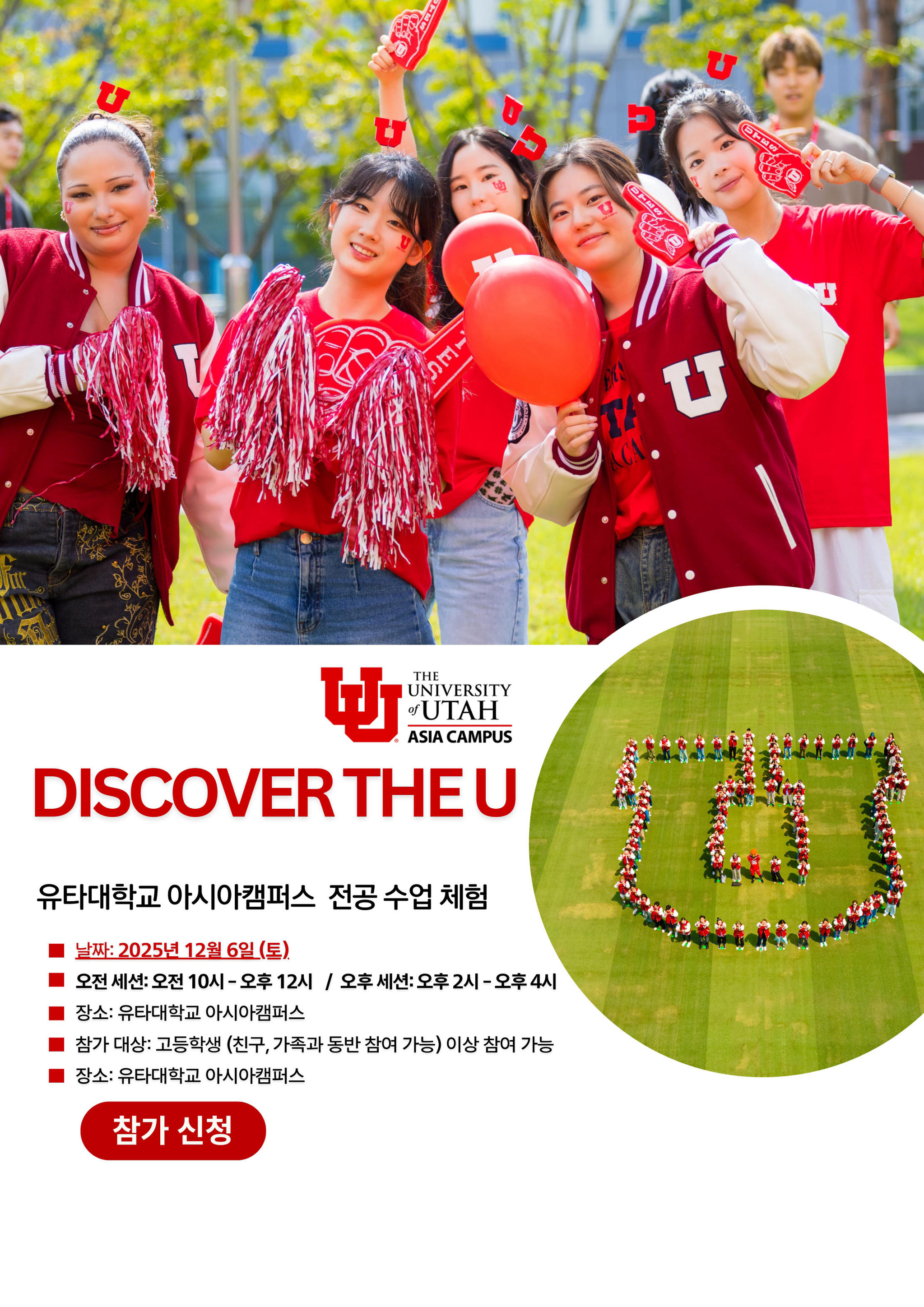 유타대학교 아시아캠퍼스(대표 그레고리 힐)는 오는 6일, 고등학생과 학부모를 대상으로 전공·진로 체험 행사 ‘Discover the U’를 개최한다. 행사는 오전 10시부터 오후 4시까지 송도 인천글로벌캠퍼스 내 유타대학교 아시아캠퍼스에서 진행되며, 미국 명문 유타대학교의 교육 방식과 학습 환경을 직접 경험할 수 있도록 구성됐다.