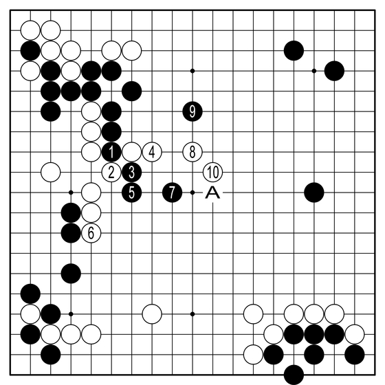 ◆AI의 추천=AI는 흑1, 3으로 끊고 싸우라고 말한다. 끊지 않은 것은 완착이란 얘기다. 이 싸움은 어렵다. 백10까지가 예상되고 흑도 A에 붙여나가는 흐름인데 누구도 장담할 수 없는 바둑이 된다. 다만 실전은 백 모양이 너무 좋다. 끊으면 5대 5니까 끊는 게 맞다.